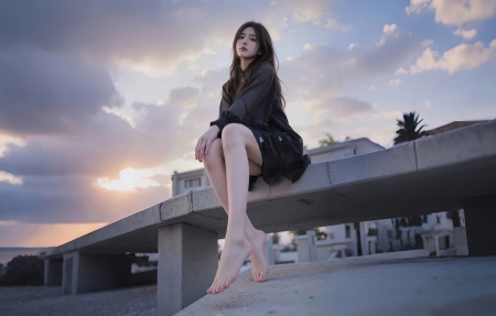 夕阳天空 美女仰拍 黑色连衣裙 4K壁纸 3840x2160