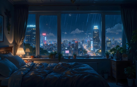 卧室 台灯 城市夜景 雨 窗景 房间温馨卧室 4K壁纸