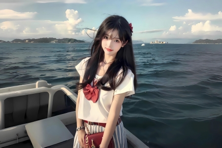 海上+船+可爱女生长发+4K壁纸全屏+3840x2400