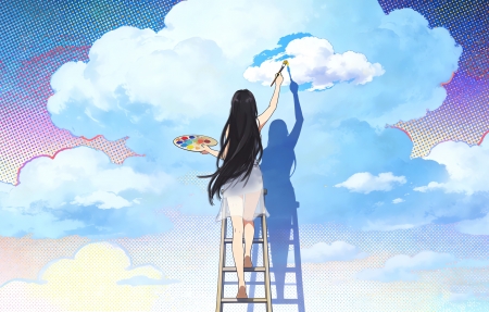 一个美女画家 背影 梯子 画云朵 4K壁纸