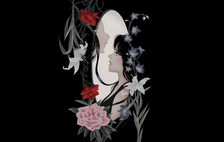 两位女性 长发 鲜花 插图 黑色背景 4K壁纸